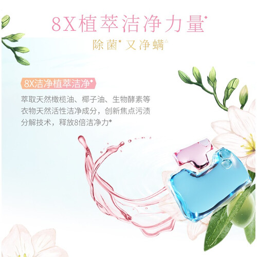 萃取天然橄榄油、椰子油和生物酵素等成分,释放8倍洁净力,轻松KO顽固污渍,令衣物洁净如新;有效除菌除螨,呵护穿衣健康。