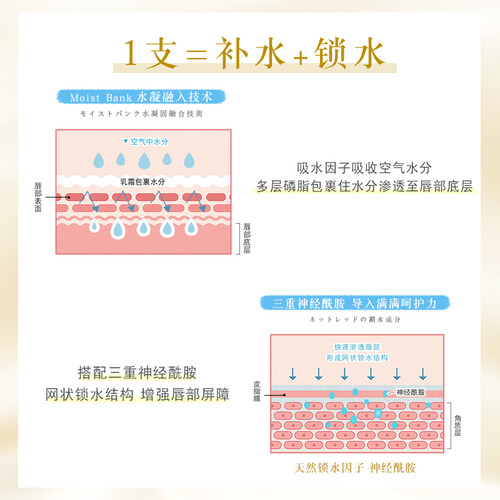 蕴含神经酰胺成分,能够锁住双唇水分,改善干燥,令双唇水润细嫩。多重植物精油精华,层层养护直至唇肌底,恢复双唇健康态。