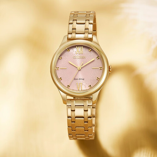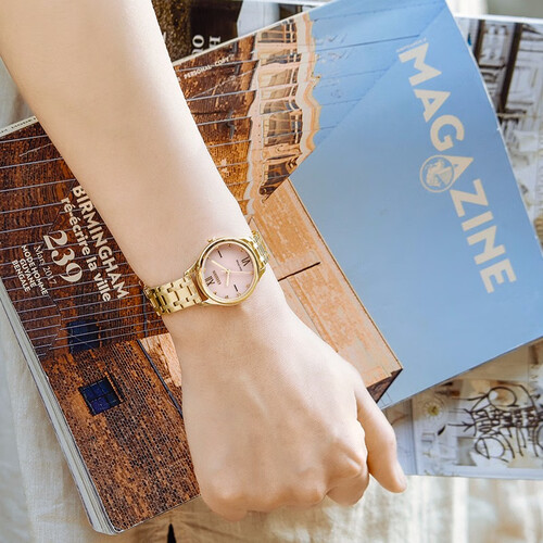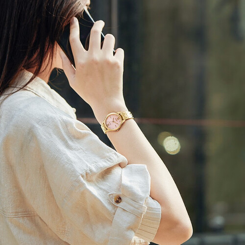 涟漪式花纹表盘,采用清新粉色调渲染,呈现腕间的异样光彩,别具甜美意蕴。玫瑰金表壳,轻奢时尚,高贵优雅。