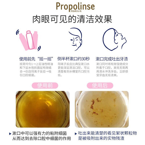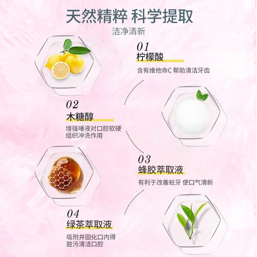 萃取樱花、茶树、蜂胶和薄荷精华,深层净澈口腔,减少牙垢残留,改善蛀牙。帮助清新口气,赶走异味,解决社交尴尬。