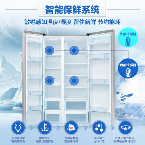 这款冰箱采用风冷无霜技术,有效提高制冷速度,降低积水的产生,不易结霜。低噪音运行,安静不扰人,呵护家人休息。