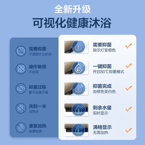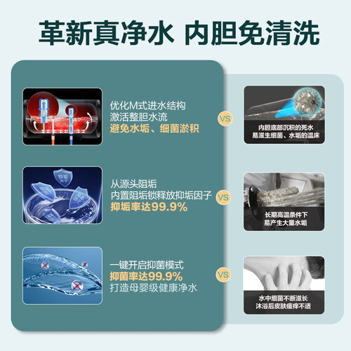 抑垢模块结合创新扰流科技,从源头抑制水垢凝结,长久使用内胆洁净如新,无需清洗。七星级净水呵护洗,家人洗澡更放心。