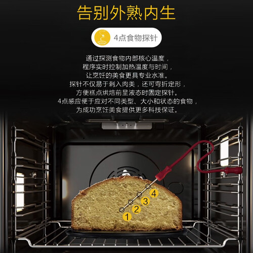 通过上下背部烤管和风机同时输送热量,食物受热均匀。味道鲜美。温度探针通过探测食物内部温度确认是否熟透,保证内外熟透。