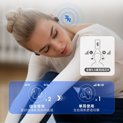 采用全新5.0真无线芯片,支持组合使用和单耳使用,随心切换,畅享动听。选用潮流配色,展现时尚气息。