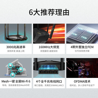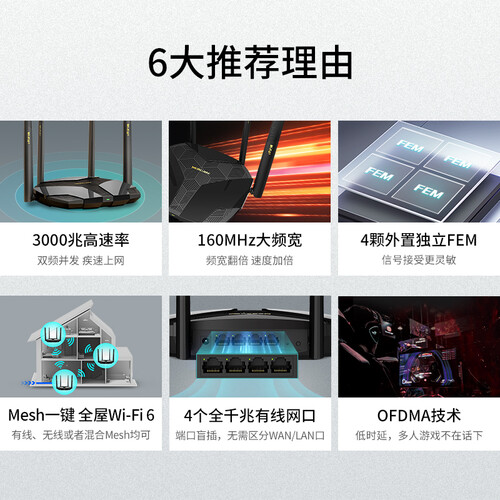 搭载了4颗外置独立FEM,增加了信号的覆盖范围,让房间内的网络更加稳定。支持与其他路由器进行互联,轻松满足各种户型的需求。