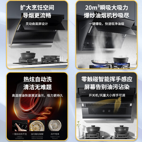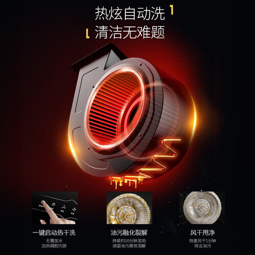 灵动曲面屏专利设计,导烟效果好,一键爆吸功能,不惧怕麻辣爆炒,快速净烟不呛鼻。热炫自动洗,高温熔油省心省力。