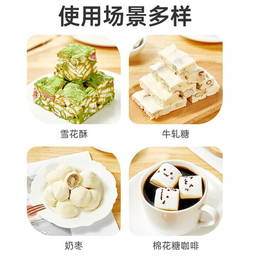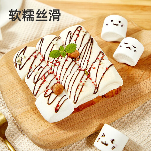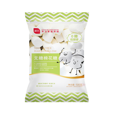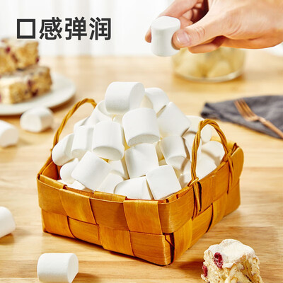 棉花糖大容量包装,每一袋含有500g,满足多口之家的甜点制作需求。棉花糖入口后口感Q弹顺滑,适合做各种甜点。