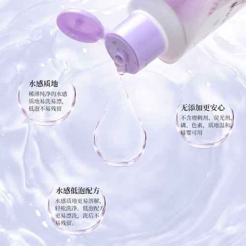 此款洗衣液为水感质地,更易漂洗,拒绝多余残留;并且多种贴身衣物都可放心清洗,满足多种洗护需求。