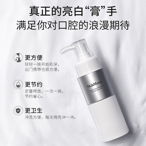 新型液体式牙膏,可干刷不沾水,而且起泡速度快,能快速渗透到牙齿缝隙,提升清洁度;还有清新茉莉香,带来清新酷爽的洁牙体验。
