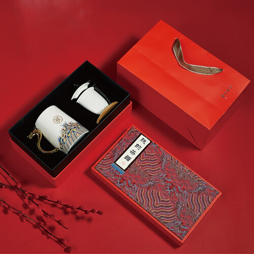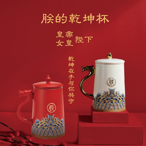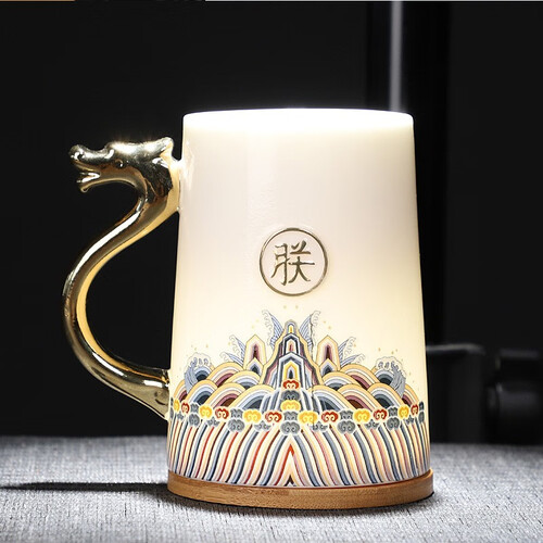 这款杯子饰有古代官服的吉祥纹样,底部有许多波涛翻滚的水浪图案,水中立一山石,寓意着福山寿海,适合送长辈做礼物。