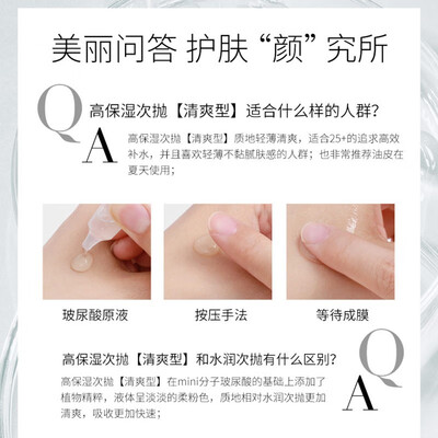 质地清爽,丰富的精华渗透肌底快速补水,焕发肌肤活力,玻尿酸深层锁水,减少水分流失,肌肤更加弹嫩紧致。