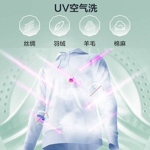 UV空气洗,祛除异味同时增加紫外线除菌,不同材料衣物都能护理。智能感知衣重和水量,自动投放洗涤剂,无需手动省时高效。
