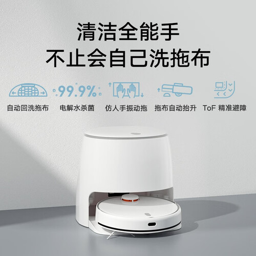 免手洗拖布的扫地机器人,拖布脏了会自动回到基座清洗,使用更加方便。内置电解水除菌模式,让地板洁净无菌,守护健康。