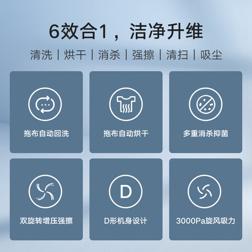 一站式自清洁设计,能自动清洗烘干拖布,彻底解放你的双手。40℃热风烘干技术,完成清洗后,对拖布进行40℃热风恒温烘干,无需晾晒。