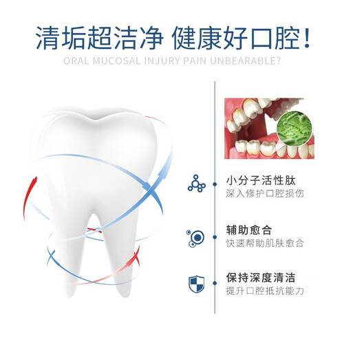 细腻的膏体,泡沫绵密又丰富,能深层清洁牙齿,并带来舒适的洁齿体验;小分子活性肽,还能深入口腔创口,提升愈合能力。
