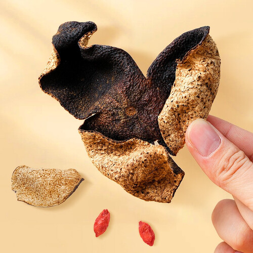 采用自然陈化陈皮,纹理凹凸有致,果皮油亮干净。片大质薄轻盈,色泽棕红自然。