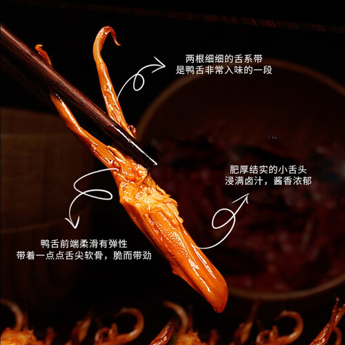 采用慢卤工艺制作,鸭舌更加入味,美妙滋味萦绕整个口腔。拥有肥美红润的外表,入口Q弹耐嚼,品尝后久久不能忘怀。