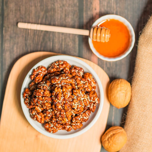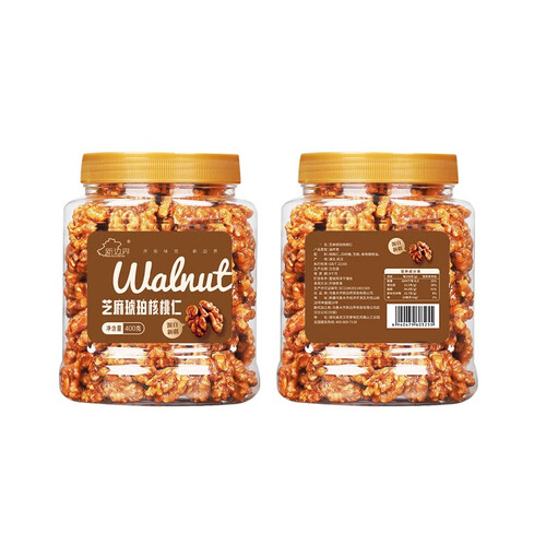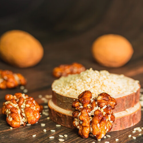 精选优质核桃和芝麻为原料,核桃仁饱满,香甜脆口,加上糖浆的包裹熬制,为您呈现出红润透亮的色泽。