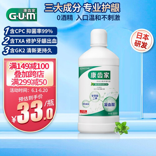 含苯扎氯铵、甘草酸二钾成分,深层洁净,营造健康干净的口腔环境。清新薄荷味,不含酒精,温和呵护口腔。