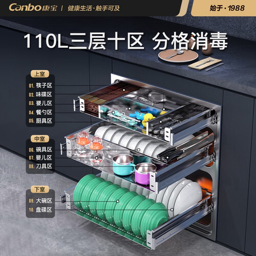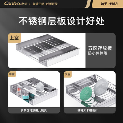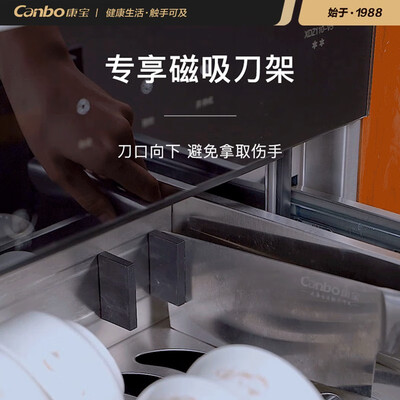 第二层架采用磁铁吸附刀具设计,可以让刀具站立,消毒更彻底。宽式层架钢材,承重能力佳,满足餐具的存放。