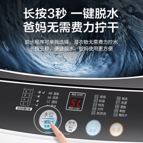 甄选高品质电机,拥有强劲的动力,洗衣更快捷;含六大安全程序,一键即可操作,使用简单,老人小孩也能轻松操作。