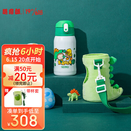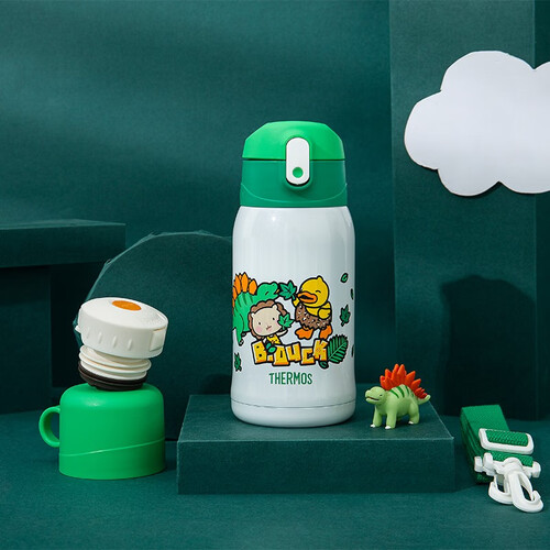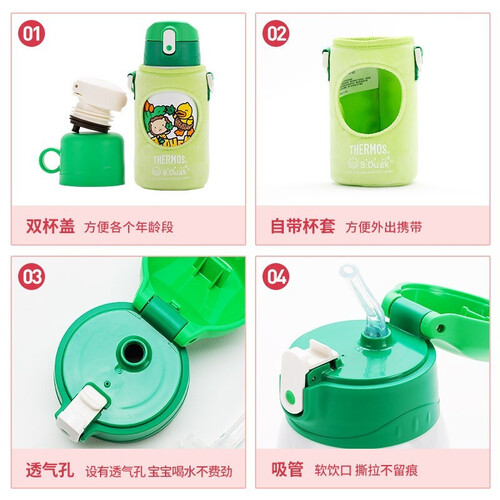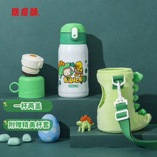 配有两个杯盖,共有三种用法,可满足宝宝不同成长阶段的使用需求。萌趣可爱的恐龙造型杯套,激发饮水兴趣。双效保温,四季通用。