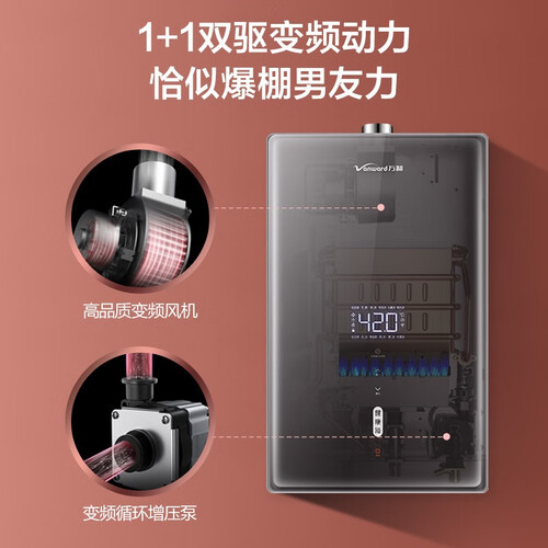 这款热水器采用全景玻璃屏幕设计,打造无边界全屏大视野,使视线一目了然,并且更容易清洁。搭载双驱变频技术,降低能耗。