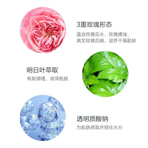 蕴含三重玫瑰形态,玫瑰花精油可以滋养舒缓干燥肌肤,令肌肤水润盈透。搭配透明质酸钠,牢牢锁住水分,补水更持久。