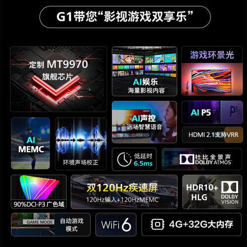 创新采用环景光专利技术,光影跟随画面变化溢出屏幕,营造浓厚的观影氛围。全生态HDR高配设计,真实呈现各种片源。