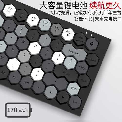 人体工程学设计,符合人机工学倾斜角度,舒适打字。大容量锂电池,搭配智能休眠功能,续航更久。