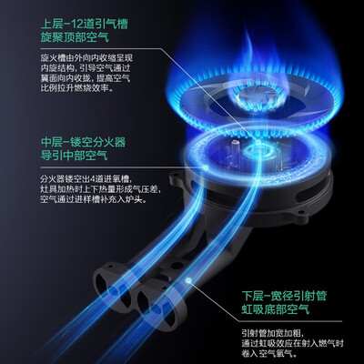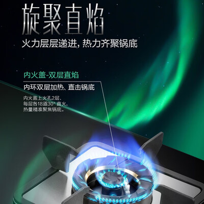 旋聚直焰设计,内火盖具有双层直焰,能够将热量聚集在锅底,减少热量损耗,外火盖的回旋围焰,能够提升燃烧效率,火力更迅猛。