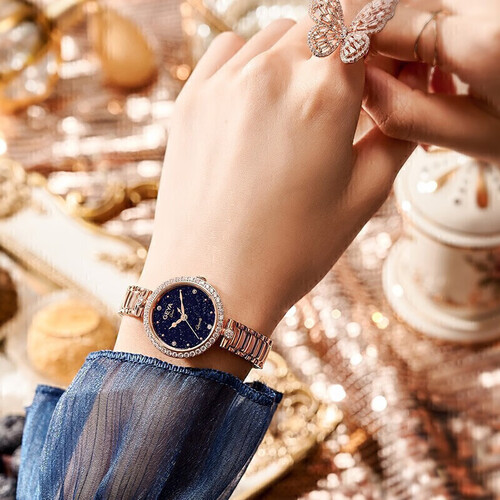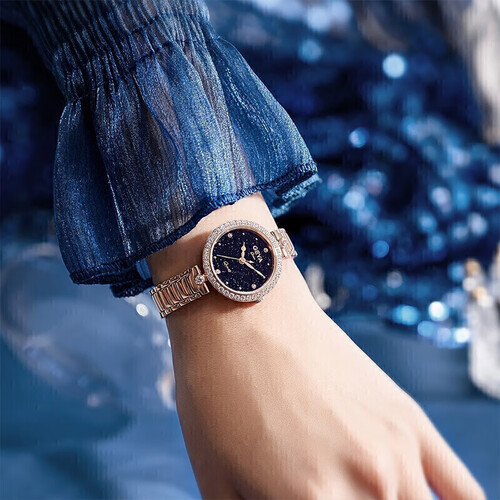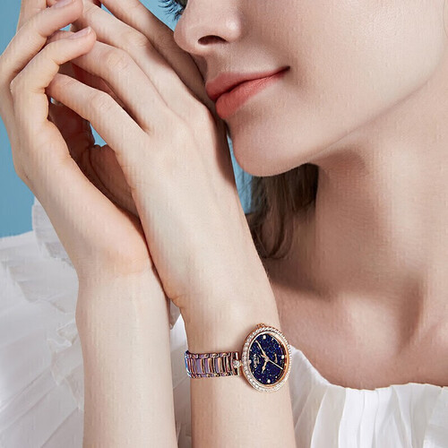 精选蓝砂星钻元素,将42颗星光钻镶嵌在表圈上,在矿物质强化镜面下熠熠生辉,璀璨流光。搭上精钢表带,整体富丽雅致。