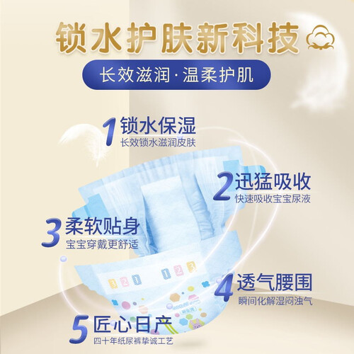 添加保湿成分的使用,可长久进行肌肤的滋润呵护,更加细腻。加入优质棉花,更易给宝宝带来绵柔体验,减少肌肤摩擦。