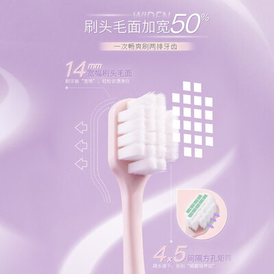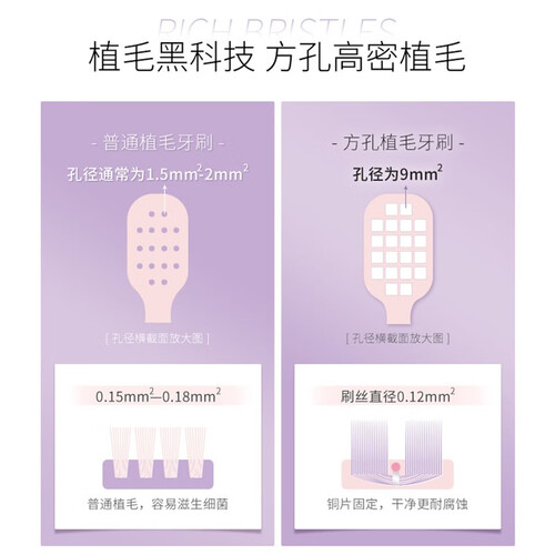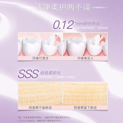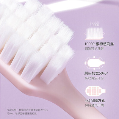 精选优质超软毛材质制作刷毛,棉花般柔软细腻,细致呵护牙龈,口感更舒适;10000根刷毛5倍高密排列,有效清洁牙齿。