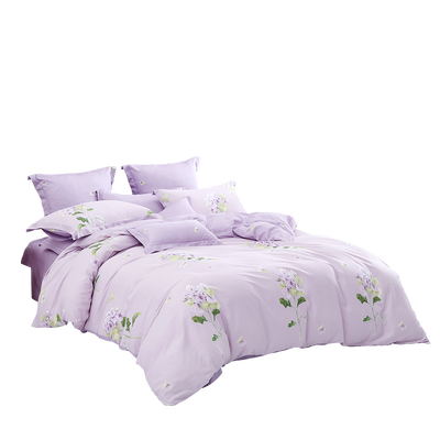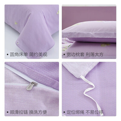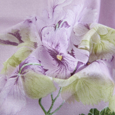 采用全棉斜纹工艺,柔软亲肤,纤维柔长,织造的面料柔软细腻。植物花卉图案,紫色背景,凸显清新田园风。