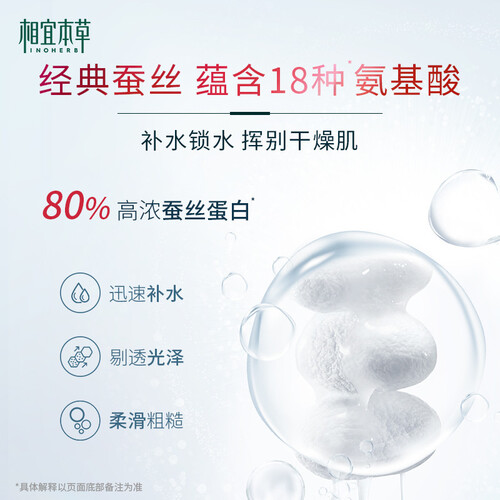 含有湖州蚕丝的成分,具有丰富的氨基酸,提高肌肤的含水量,柔嫩保湿。配以甘草、茯苓等成分,改善暗沉,提亮肤色。