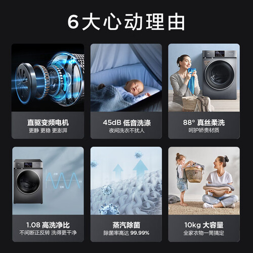 磁悬浮直驱变频技术,直接驱动减少噪音。88度真丝柔洗技术,细致入微呵护真丝。43分贝超静洗涤,不打扰家人休息。