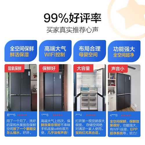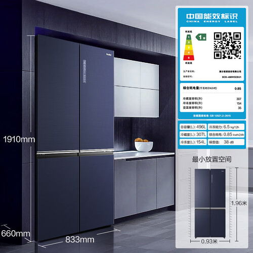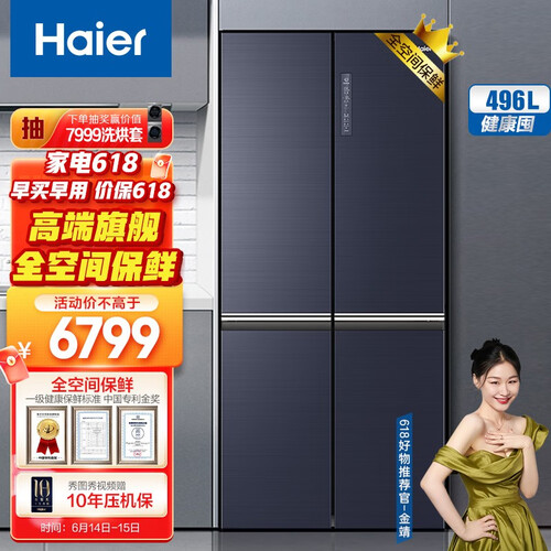 海尔全空间保鲜科技,一级健康保鲜标准,冷藏区精分干湿,存放果蔬、珍品新鲜如初。冷冻智能恒温,肉类长期保鲜营养不流失。