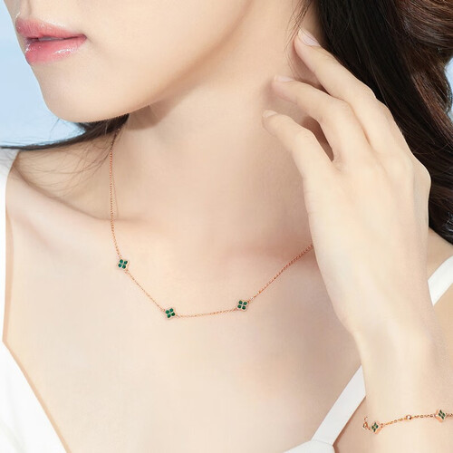齐整排列的四叶草项链,层次分明富有时尚感,轻易流露出摩登气质。孔雀石陪衬点缀其上,投放出柔和光晕,更显造型独特魅力。