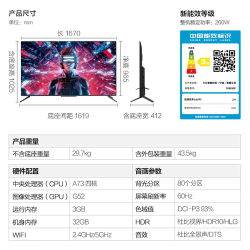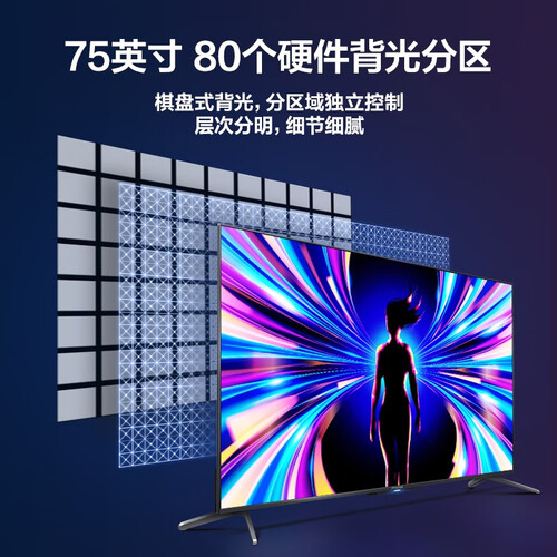 整个全面屏拥有80个分区,独立控制画面的层次分明。使用原彩色温标准的光源,还原出自然光线的效果。