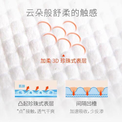 采用3D珍珠表层的设计,自然贴合宝宝的身体,不会出现侧漏或者后漏的情况。拥有双层立体隔边,舒适的包裹感受,宝宝不哭闹。