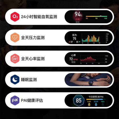 OLED大屏,带来开阔的视野;全面的健康守护功能,守护身体健康;提供了12种运动模式,让运动科学有效。