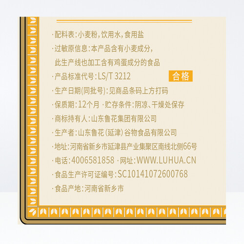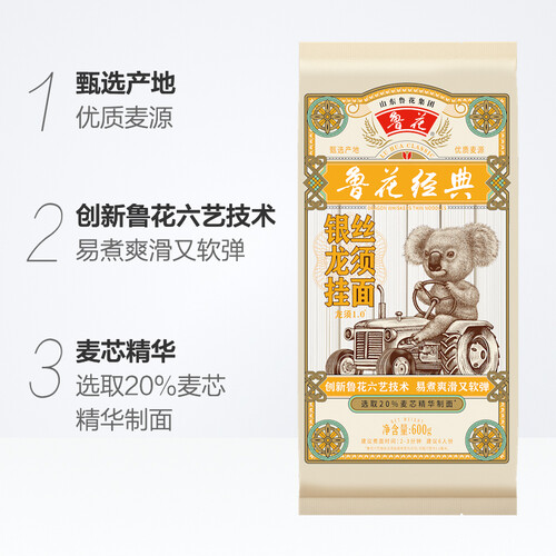 精选地道优质小麦为原料,只萃取麦芯精华部位制作,成就好品质面粉。经过创新鲁花六艺技术,面条质地细腻,耐煮不浑汤。