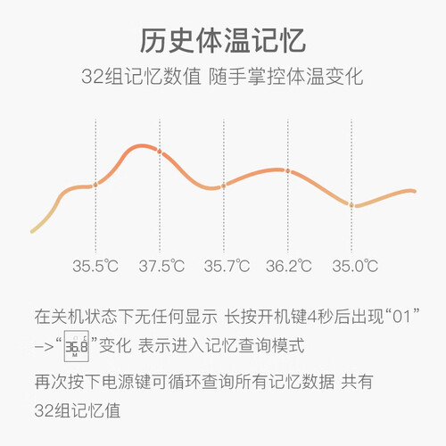 可以存储7组记忆值,方便观测这几次测温的体温波动,更了解孩子身体情况。配备橙色背光大屏,夜间测温也清晰。