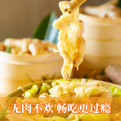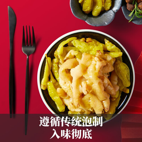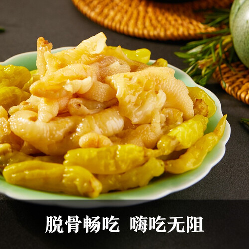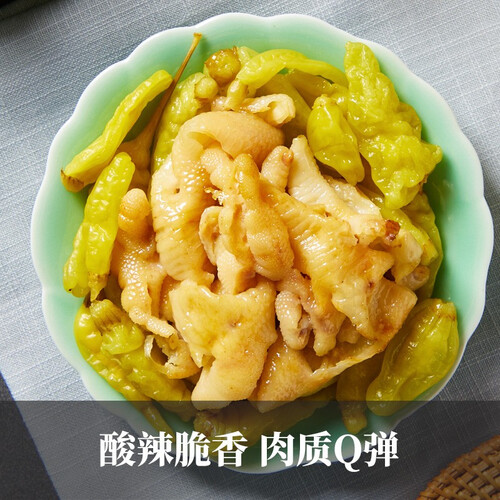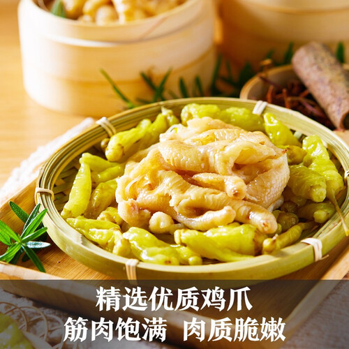 选用富有弹性的新鲜鸡爪,去除鸡爪死皮确保质地紧密,纯正色泽好吃美味。搭配野山椒,辣味正宗让你大汗淋漓。