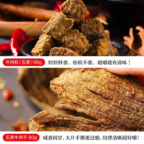 牛肉制品不仅口感有嚼劲,营养更丰富。6种美食一步到位,全牛宴礼盒轻松满足选择困难症,肉香浓郁,越嚼越有滋味。