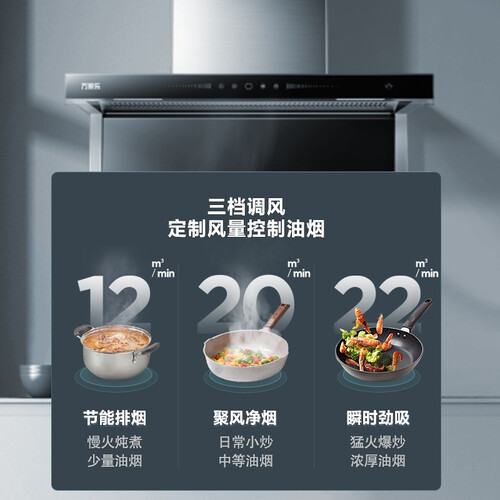 7字型设计,顶侧双重净烟,捕捉油烟更快速不跑烟,采用瞬时变频增速技术,拥有澎湃大吸力,不再惧怕辣炒浓烟。