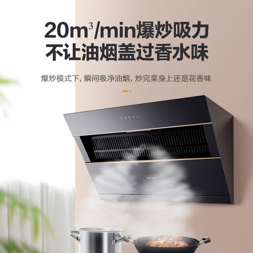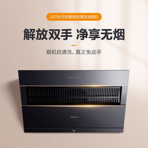 万和热清洁技术,先溶解油污后甩净,无需手动加水,省去繁杂操作。具有20立方米强劲的大吸力,快速吸走烹饪产生的油烟。