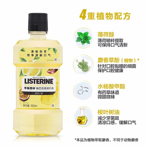 采用植物配方,温和不刺激,全方位清洁口腔的同时,帮助清新口气。含麝香草酚成分,持久保护口腔健康,去除口腔黏膜细菌。