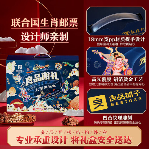 18mm宽pp材质提手设计,无毛边的提手提拿更加舒服,拎取更加暖心。铝箔烫金工艺,敦煌元素设计,美观的外表凸显送礼用心。
